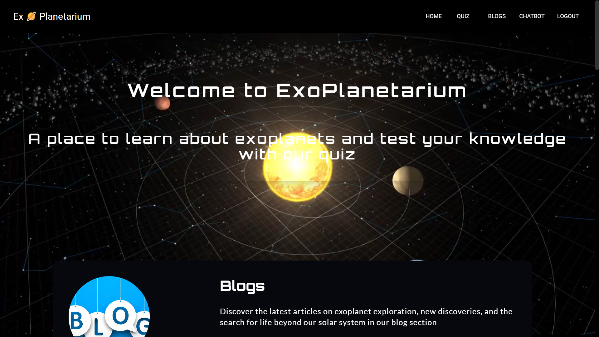 An interactive learning platform focused on the fascinating world of exoplanets. It features engaging space-themed blogs, a quiz module to test your knowledge, and an AI-powered chatbot that answers your astronomy questions in real-time — making space exploration both fun and educational.