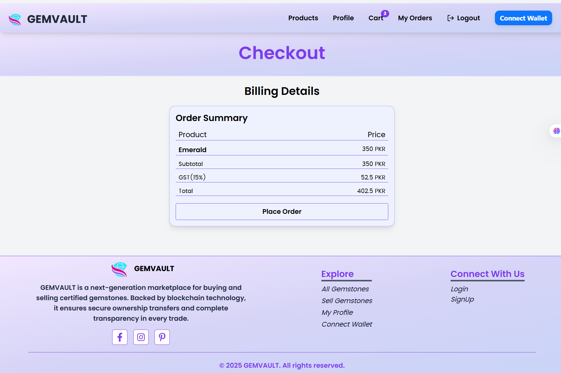GemVault is a blockchain-based C2C marketplace for trading certified gemstones. It ensures secure and transparent transactions by verifying sellers through government-issued certificates and tracking ownership on-chain. Each gemstone is uniquely identified, preventing duplicate or unauthorized listings and enabling trustworthy peer-to-peer trading.
